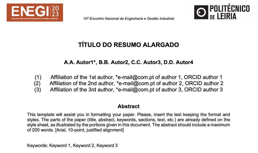 Os resumos podem ter entre 1 a 4 páginas. Depois de formatados de acordo com o template acima, os resumos deverão ser submetidos no link abaixo para aprovação pela Comissão Científica até 30/10/2023 para o email: enegi.estg@ipleiria.pt